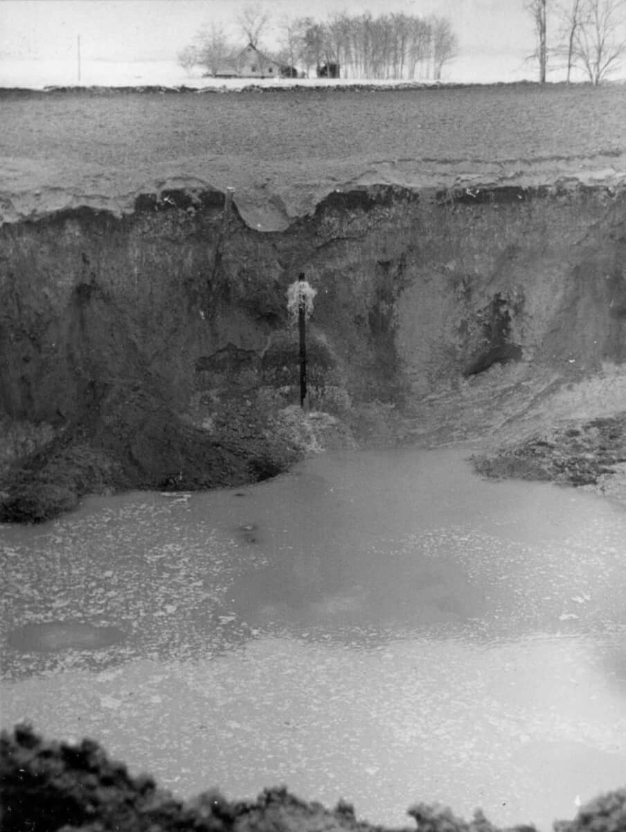 A kráter 1961. december 29. és december 31. között 2 nap, 15 óra és 10 perc alatt keletkezett. A battonyai határban az Országos Kőolaj- és Gázipari Tröszt Alföldi Kőolajfúrási Üzemének (OKGT AKÜ) egyik erdőszéli kutatótelepén éjszaka földgáz tört ki. A kitörések leggyakoribb oka, hogy a fúrásnál használt öblítőiszap nem tölti be feladatát. A fúrás során a fúrórudazatból nagy nyomáson kifecskendező öblítőiszap nemcsak a fúró által felaprított kőzetszilánkokat hozza a felszínre, hanem egyúttal ennek az iszapnak a nyomása szorítja vissza a tárolórétegekbe az olajat vagy gázt. Ezért pontosan meg kell tervezni, hogy egy adott mélységben milyen fajta öblítőiszappal kell fúrni. Amennyiben az iszap fajsúlya az előírtnál kisebb, avagy például korábban elérik a túlnyomásos tárolórétegeket a tervezettnél, úgy a lyukba törő gáz vagy olaj pillanatok alatt kisepri az útjában álló, túlzottan híg öblítőiszapot. Az iszaposzlop egyensúlyát sokszor véletlenül bontják meg a munka során, mint a Battonya-37. számú fúrásnál is történt. A 900 m körüli mélységben megszorult fúrót igyekeztek kiszabadítani. Közben a gáz a fúrólyukba nyomult. A gáz visszaszorítására ekkor túlságosan nagy ellennyomást alkalmaztak, és ezért a fúrólyuk acélcsővel még le nem zárt rétegei megrepedtek. Hiába zárták el a csővel védett szakasz tetején a több száz atmoszféra nyomás ellen biztosító kitörésgátlót, a gáz megfékezhetetlen elemi erővel a megrepedt rétegeken keresztül, az acélcsövön kívül nyomult a felszínre. A kráterképződés folyamán váltakozó hevességgel tört fel a földgáz, iszapot, kőzettörmeléket és nagyobb kőtömböket dobva a felszínre – ezekből gátat képezve a kráter körül. Az egymáshoz vagy a fúrótorony fémszerkezetéhez ütődő kődarabok szikrái lángra lobbantották a gázt. Egymást követték a robbanások, erős fényük az egész vidéket bevilágította. A berobbant gáz olykor 40 méter magasságú lánggal égett. Érdekesség, hogy egy ideig lávafolyamként sárga, tiszta agyag is a felszínre ömlött. Sok fa a kráter környékén letöredezett vagy a nagy hőségben kiszáradt. Kisebb-nagyobb földrepedések is keletkeztek, ezeken át is előtört a gáz, kisebb lángoló kráterek alakultak ki.