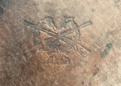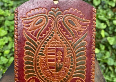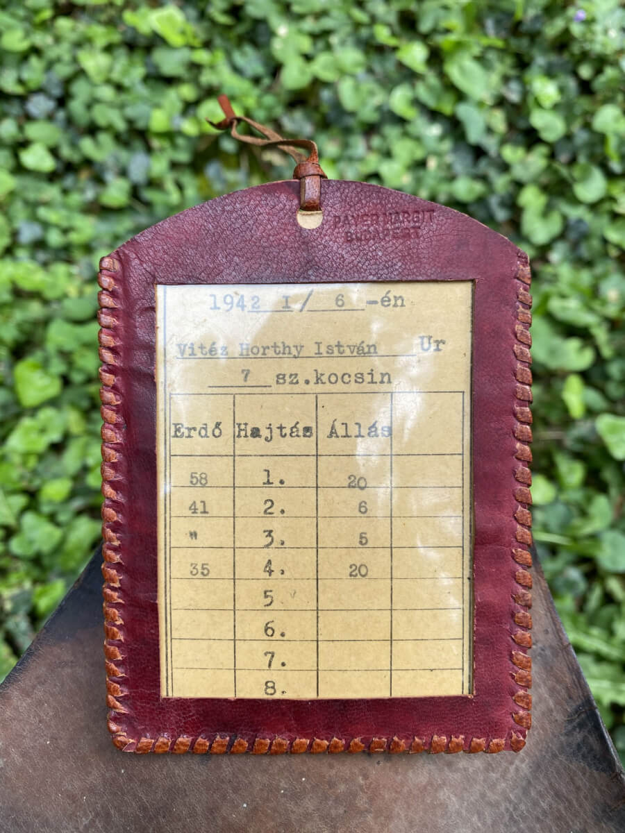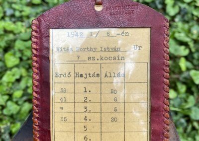 „12_Horthy István vadászjegye (1942. január)” A bőrtok Budapesten készült Payer Margit műhelyében. A kormányzóhelyettes halála után tisztiszolgája hozta haza poggyászát, a kiállított tárgy ezen ingóságok közül került Tarkó Gábor helytörténész magángyűjteményébe.